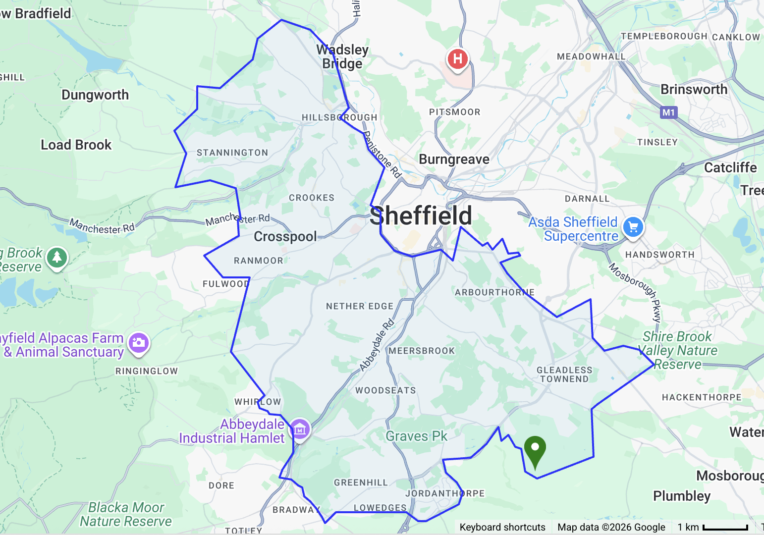 • Walkley • Crookes • Wisewood • Hillsborough • Middlewood • Stannington • Malin Bridge • Broomhill • Broomhall • Hunters Bar • Endcliffe • Sharrow • Greystones • Bannercross • Millhouses • Nether Edge • Meersbrook • Heeley • Woodseats • Greenhill • Jordanthorpe • Lowedges • Norton • Gleadless • Gleadless • Intake • Arbourthourne { Please enquire if you are unsure if you are within the delivery area}
