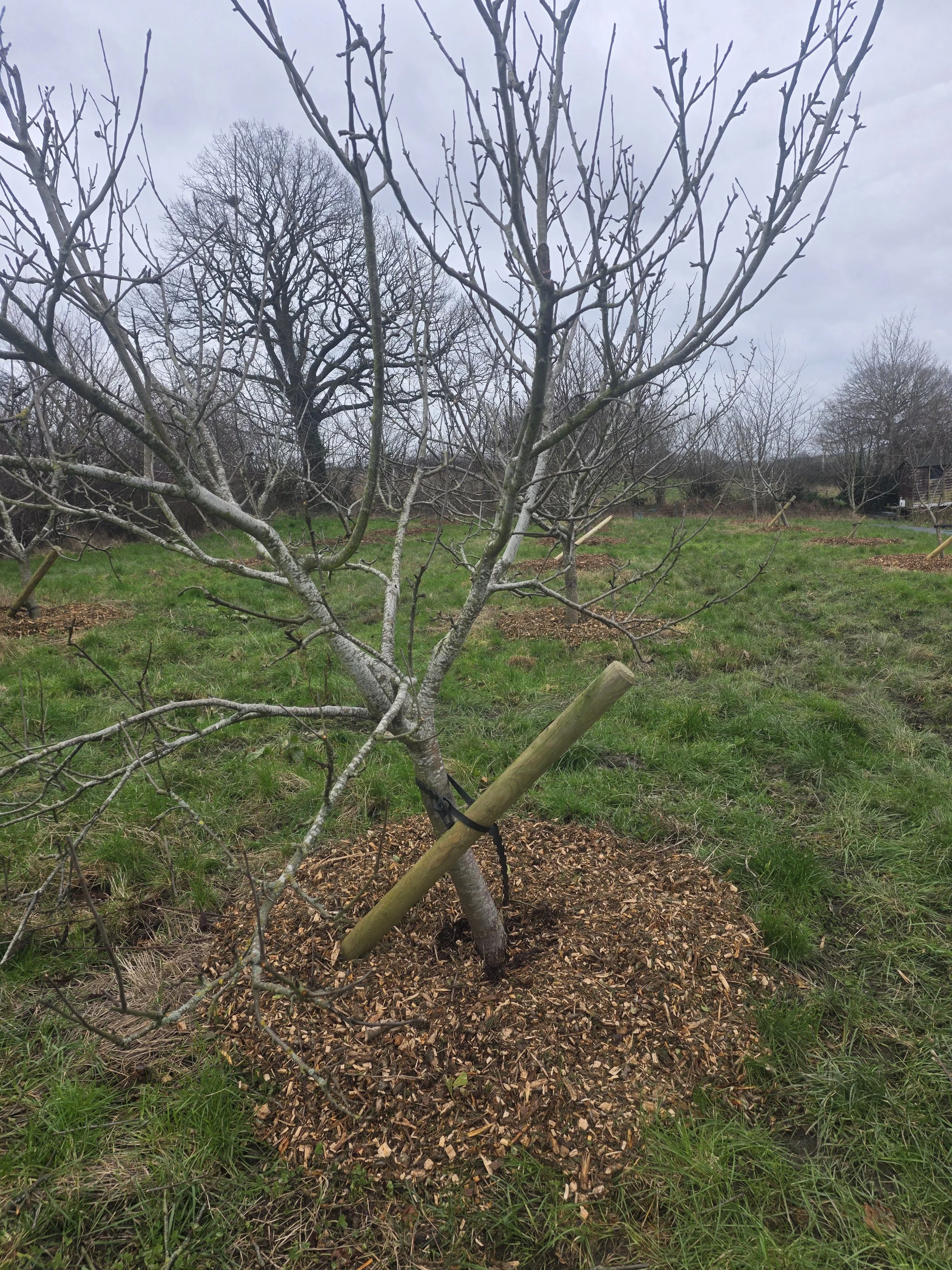 In addition to all that woodchipping, all the trees have been pruned—always a winter job for apple and pear trees — and staked where necessary to stop them toppling over (see picture at bottom of page). With the wet winters of late, our trees are prone to tipping, as waterlogged ground offers less support to the roots, and the site is very exposed to the predominant south-westerly winds .