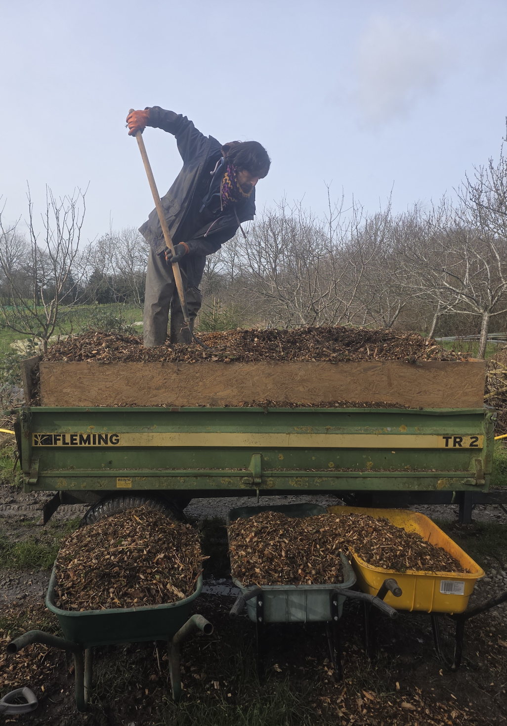 Most of the woodchip has been used for our paths—the main routes to the polytunnels and the smaller paths between the growing beds—and in a wet winter like the one we are experiencing, this makes life a lot more pleasant underfoot. But the 39 trees in our orchard get a fair measure too: two barrow loads per tree. There are several reasons why woodchip is so good in orchards. Firstly, it breaks down slowly, feeding soil fungi and encouraging a fungal-dominant soil—exactly what apple trees prefer. Secondly, decomposing woodchip attracts earthworms, which we all love, as they help to create healthy soil by improving aeration and contributing their nutrient-rich wormcasts. Thirdly, woodchip helps to conserve soil moisture under the trees during dry spells, and finally, it suppresses weeds.